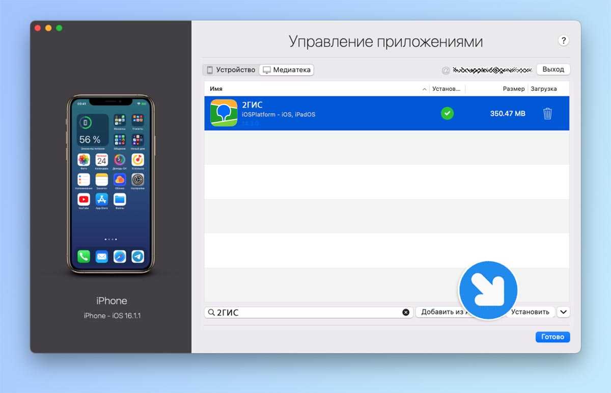 Выберите пункт Установить, чтобы перенести приложение на подключенный iPhone.