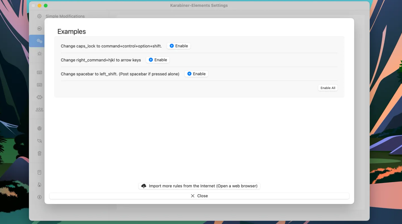 Самый простой способ работать со сложными модификациями с помощью Karabiner — загрузить несколько модификаций, представленных другими пользователями. Вы также можете написать свой собственный файл в формате JSON, но это выходит за рамки данной статьи. Даже веб-интерфейс, который был создан для упрощения работы, не совсем дружелюбен к новичкам.