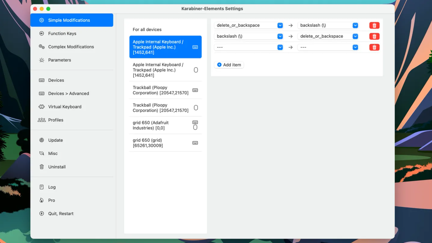 Для более сложных модификаций или переназначения других клавиш можно использовать бесплатную программу Karabiner Elements. Karabiner может назначить практически любую клавишу, а также выполнить более сложные модификации. Я использую ее, чтобы поменять местами клавиши Backspace и Backslash на внутренней клавиатуре моего MacBook, чтобы они соответствовали моей внешней клавиатуре, а также поменять местами Command и Control на внешней клавиатуре вместо встроенного инструмента.