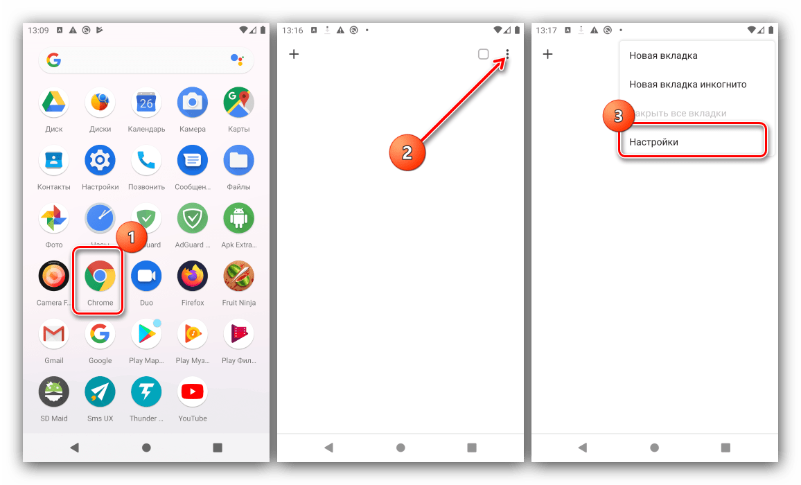 - Запустите Хром, после чего нажмите на кнопку с 3 точками для вызова меню, в котором выберите пункт «Настройки».
