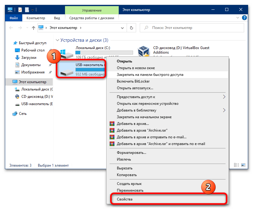 Подождите, пока накопитель определится системой, далее откройте «Компьютер»/«Этот компьютер», затем в разделе «Устройства и диски» найдите вашу карту памяти, кликните по ней правой кнопкой мыши (ПКМ) и выберите пункт «Свойства».