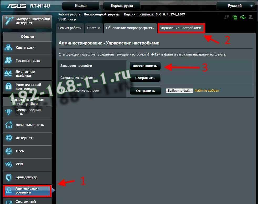 рекомендуется делать в том случае, когда есть доступ в веб-интерфейс. Такой вариант так же удобен, когда, например, устройство прикреплено высоко на стене или лежит на шкафу. У каждого маршрутизатора и точки доступа WiFi есть в веб-интерфейсе раздел, через который можно восстановить заводские параметры. Например, на роутерах ASUS это раздел Администрирование >>> Управление настройками