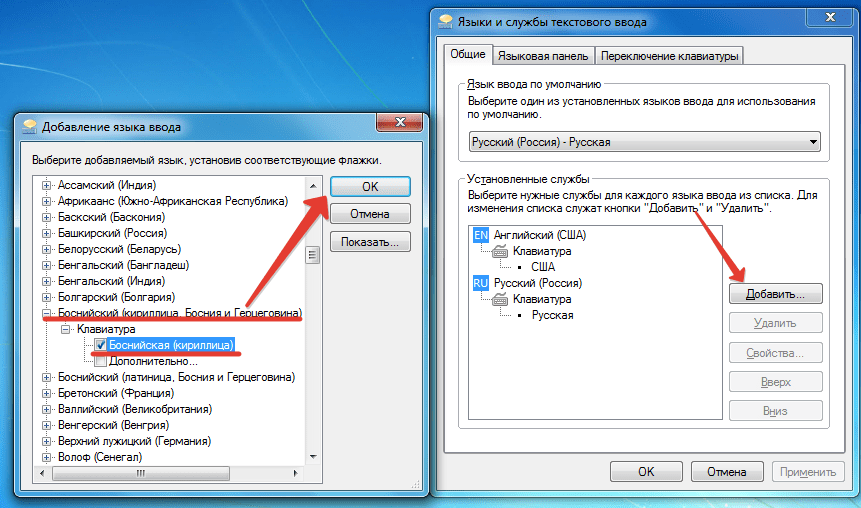 Нажмите кнопку «Добавить» и выберите язык. Раскройте его, укажите метод ввода и нажмите «ОК».