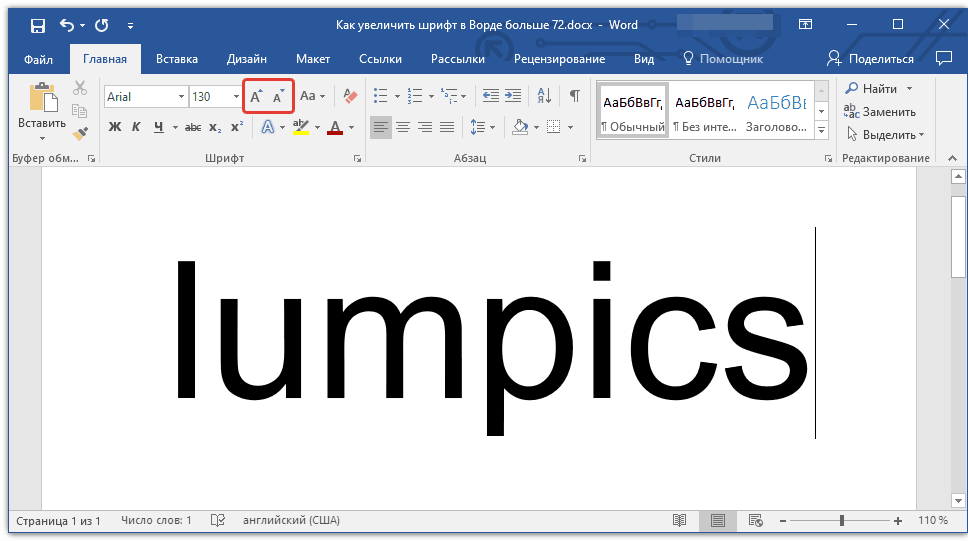 2. В группе инструментов «Шрифт» (вкладка «Главная») нажмите кнопку с большой буквой А (справа от окна с размером) для увеличения размера или кнопку с меньшей буквой А для его уменьшения.