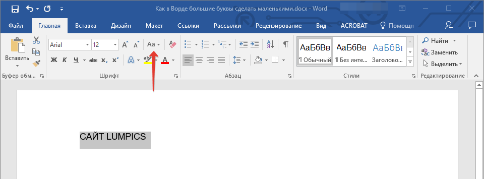 Помимо непосредственного изменения регистра со строчного на прописной и наоборот, Microsoft Word позволяет в буквальном смысле сделать то, что указано в заголовке данной статьи – превратить большие буквы в маленькие, а точнее, обычные прописные в малые прописные, получив таким образом тип начертания, который называется капите́ль. Полученные в результате символы по своему размеру будут немного больше строчных (но меньше прописных), а их вид останется именно таким, который имеют буквы данного регистра.