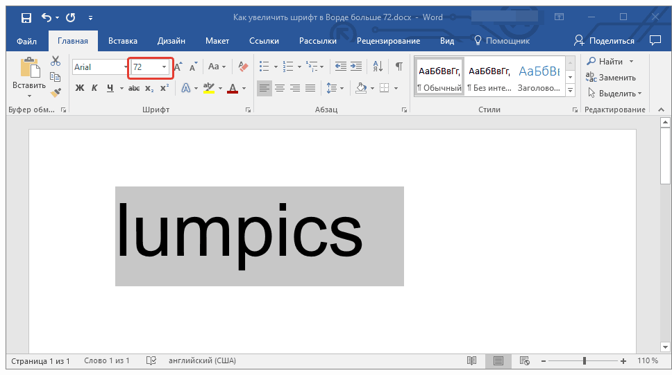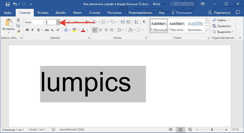1. Выделите текст, размер которого вы хотите сделать больше стандартных 72 единиц, с помощью мышки.