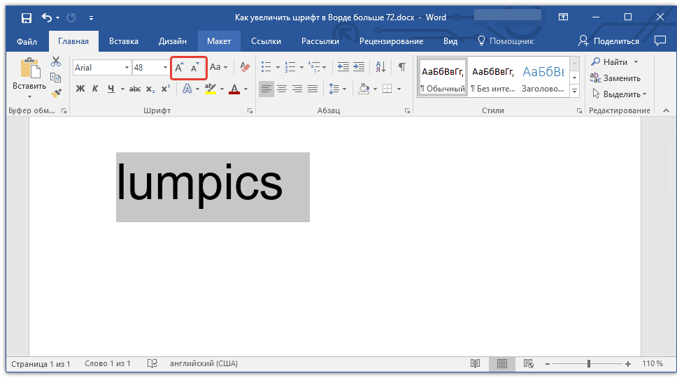 Есть ещё один способ выбора нужного кегля. В этой же вкладке Главная, рядом со стрелкой, вызывающей выпадающую табличку с числовыми значениями кегля, можно найти две буквы. Рядом с буквой большего размера находится стрелочка, указывающая вверх. Рядом с буквой меньшего размера — стрелка, показывающая вниз. Мы должны понимать их в значении больше или меньше.