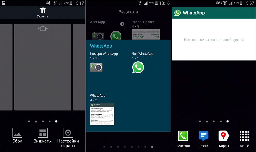 Чтобы добавить виджет WhatsApp на экран смартфона Android, коснитесь чистой области экрана и не отпускайте пару секунд. Затем выберите пункт “Виджеты”. В открывшемся списке найдите виджет WhatsApp, листая страницы с виджетами и коснитесь его. В появившемся окошке найдите виджет “WhatsApp 4 х 2”, затем коснитесь его и перетащите в нужное место на экране телефона.
