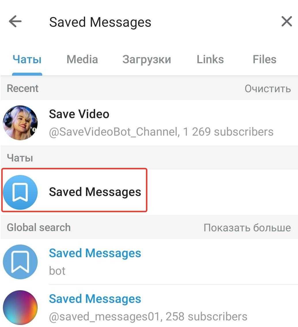 - Написать в поиск Saved Messages и нажать на появившийся чат в телеграмме.