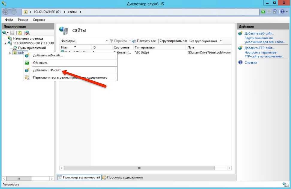 Раскройте диспетчер IIS и слева в подменю есть папка «Сайты». Если кликнуть по ней правой кнопкой мышки, всплывет подсказка. В ней следует щелкнуть на «Добавить FTP».