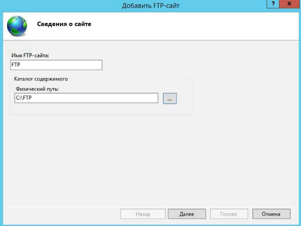 После чего задаём имя сайта и каталог к которому физически будет обращаться протокол ftp