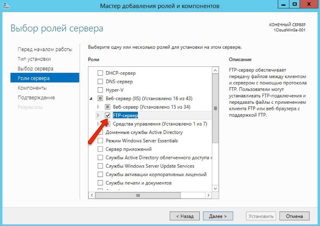 В подменю серверных ролей нужно поставить галочку для сервера IIS. После этого графа развернется и представит новые настройки: здесь потребуется кликнуть на FTP