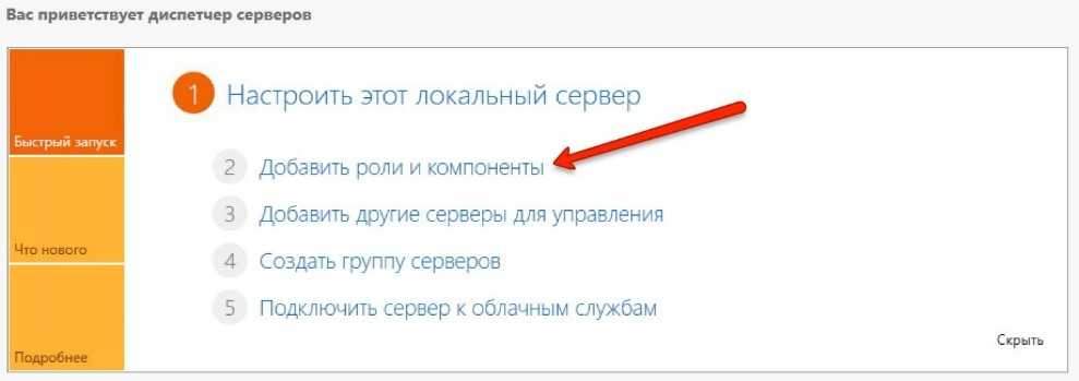 Для начала нужно зайти в «Пуск» и войти в «Диспетчер серверов», в нем необходимо выбрать добавление роли (пункт два).