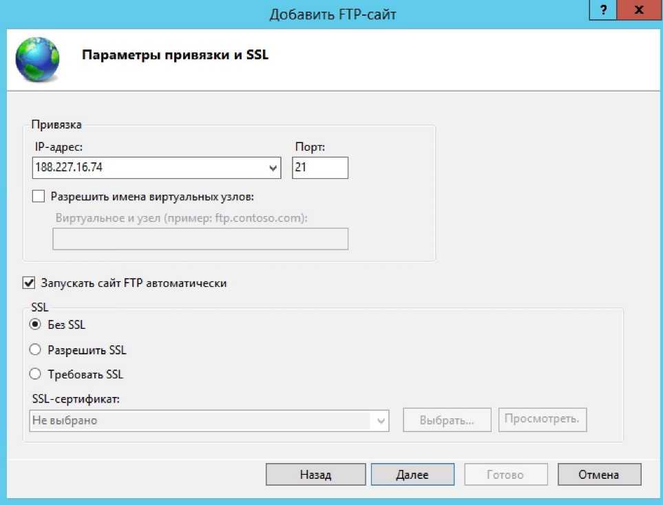 В окне появится запрос на выбор айпи-адреса. Нужно проверить, чтобы введенный айпишник был одинаковым с тем, что значится в панели управления. Желательно выбрать еще функцию автоматического запуска, расположенной ниже, и в ней «Без SSL».
