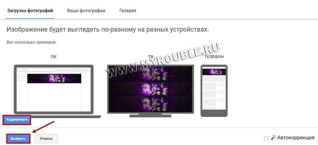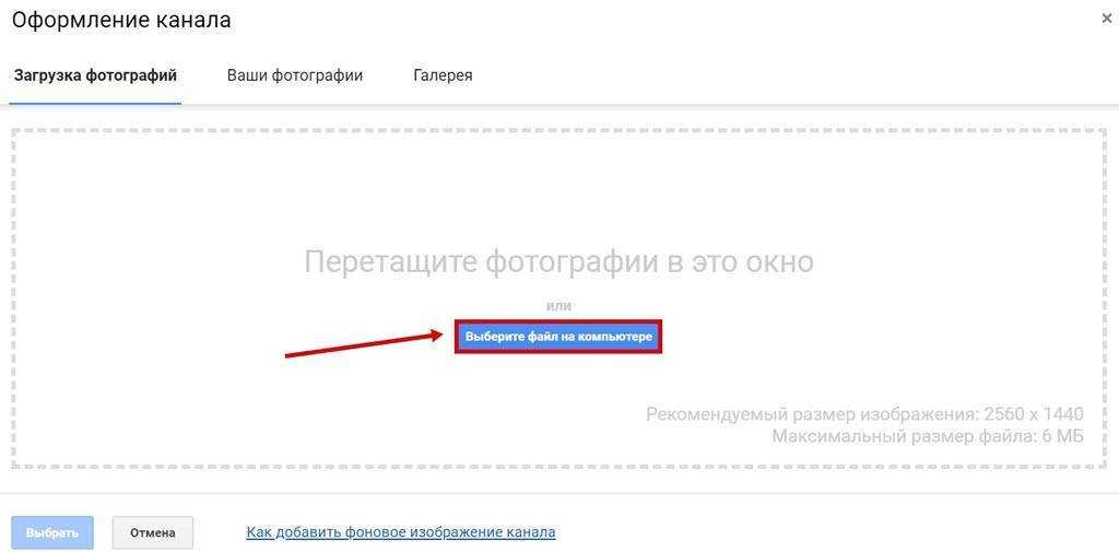 Для установки шапки — кликаем на «Добавить оформление канала», затем выбираем файл и, если расположение картинки вас устраивает, кликаем «Выбрать», в противном случае — «Кадировать»: