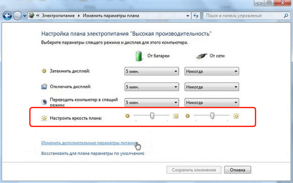 Еще один вариант прибавить яркость на ноутбуке – войти в настройки электропитания. Бегунок, чтобы сделать экран темнее, расположен внизу. В этом же меню можно кликнуть по «Настройка схемы электропитания», откроется меню работы экрана. В зависимости от того, подключен он к сети или нет, ниже можно увидеть регулировку яркости на ноутбуке для обоих случаев. То есть пользователь может задать, что в случае отключения гаджета от сети подсветка останется на уровне 100% или же снизится до 50% (любой удобный вариант), а при подключенном питании уровень должен оставаться неизменным.