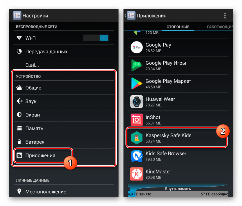 Снова перейдите в «Настройки», в блоке «Устройство» нажмите по строке «Приложения» и в представленном списке найдите «Kaspersky Safe Kids».