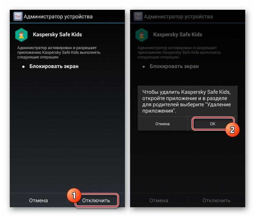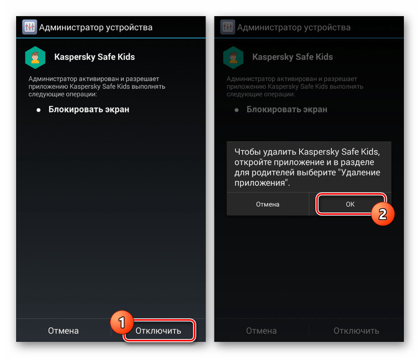 Повторно тапнув по строке «Kaspersky Safe Kids», нажмите кнопку «Отключить» и подтвердите деактивацию программы в качестве одного из администраторов устройства. За счет этого будет деактивирована защита приложения от удаления.