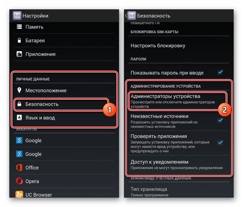 Перейдите в системные «Настройки», найдите блок «Личные данные» и откройте «Безопасность». На этой странице в свою очередь следует нажать по строке «Администраторы устройства» в разделе «Администрирование».