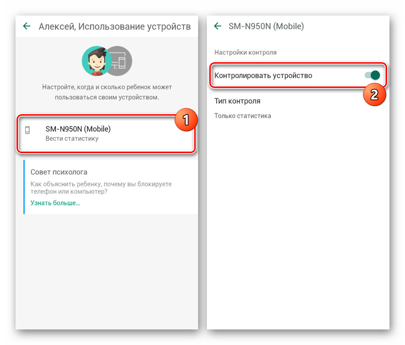 На следующем этапе из списка девайсов выберите модель нужного смартфона и в строке «Контролировать устройство» измените положение ползунка. Чтобы изменения вступили в силу, обязательно перезагрузите телефон ребенка и подключитесь к интернету.