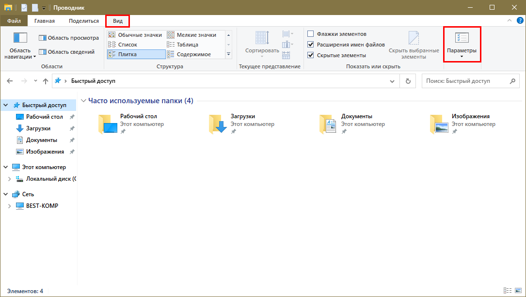 Открыть настройки можно двумя методами: через панель управления или непосредственно сам проводник. Второй вариант менее затратный по времени, так что сначала лучше ознакомиться именно с ним. Для открытия настроек нужно лишь перейти во вкладку «Вид» и нажать на соответствующую кнопку в правой части окна:
