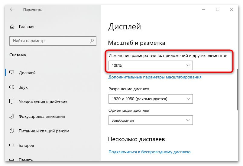 По умолчанию откроется вкладка «Дисплей», которая и нужна в нашем случае. В центральной части окна отыщите раздел «Масштаб и разметка», где нужно развернуть меню «Изменение размера текста, приложений и других элементов». Если у вас рекомендовано значение «125%», то выберите «100%».