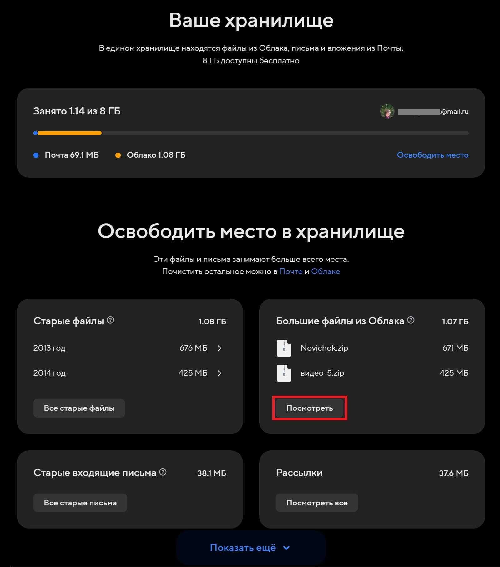 Рис. 3. Сервис Майл ру для очистки почты и Облака от ненужных файлов, которые занимают много места.
