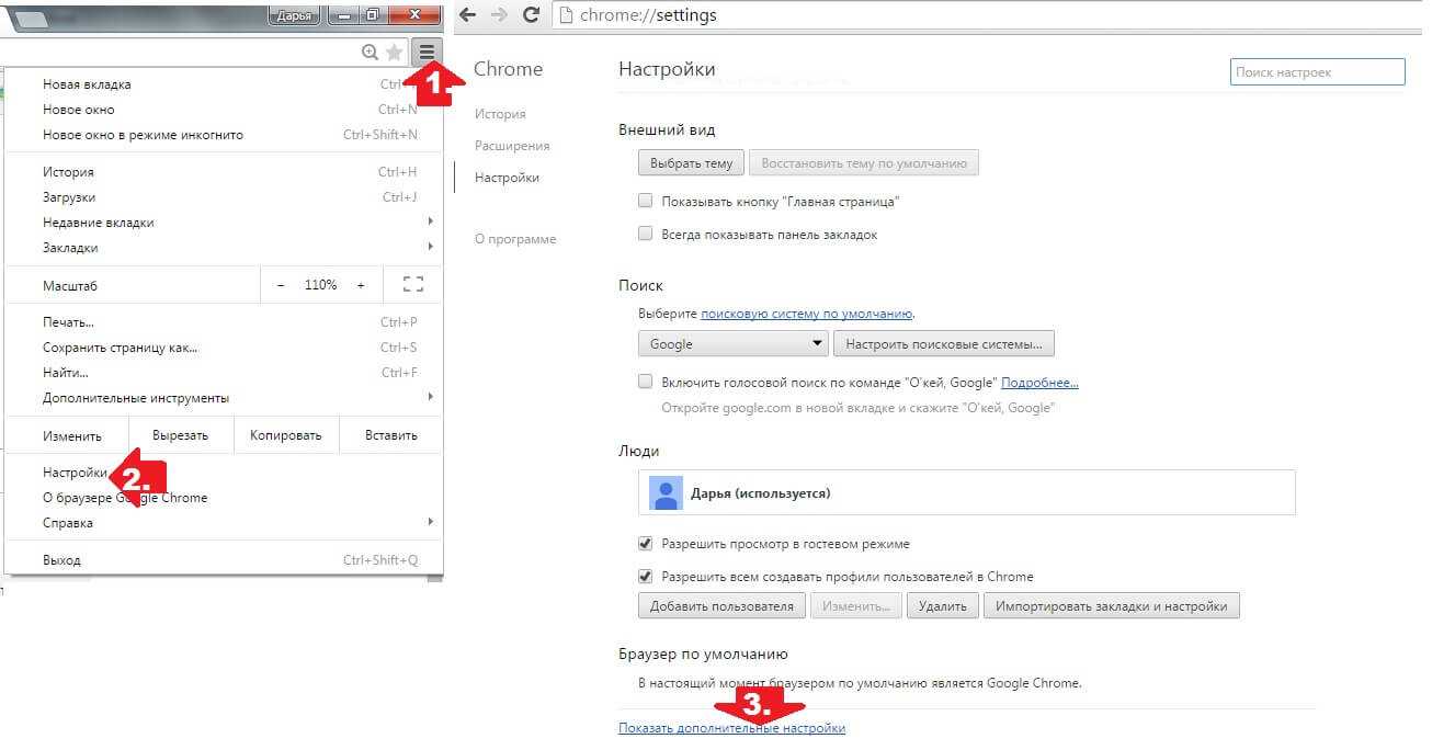 Аналогичным образом настраивается шрифт и для работы в Google Chrome. В этом случае также для начала потребуется открыть меню браузера, выбрать в нем пункт «Настройки», а затем уже клацнуть вкладку «Показать дополнительные настройки»: