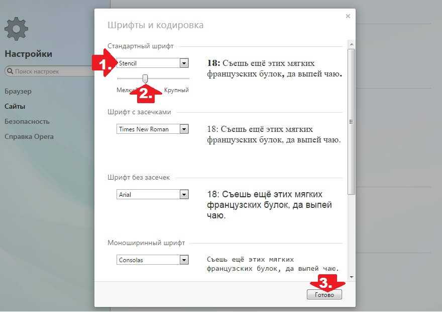 В то же время дабы подобрать иной шрифт для веб-страничек в Opera, понадобится заглянуть в меню настроек браузера (раздел «Сайты»):