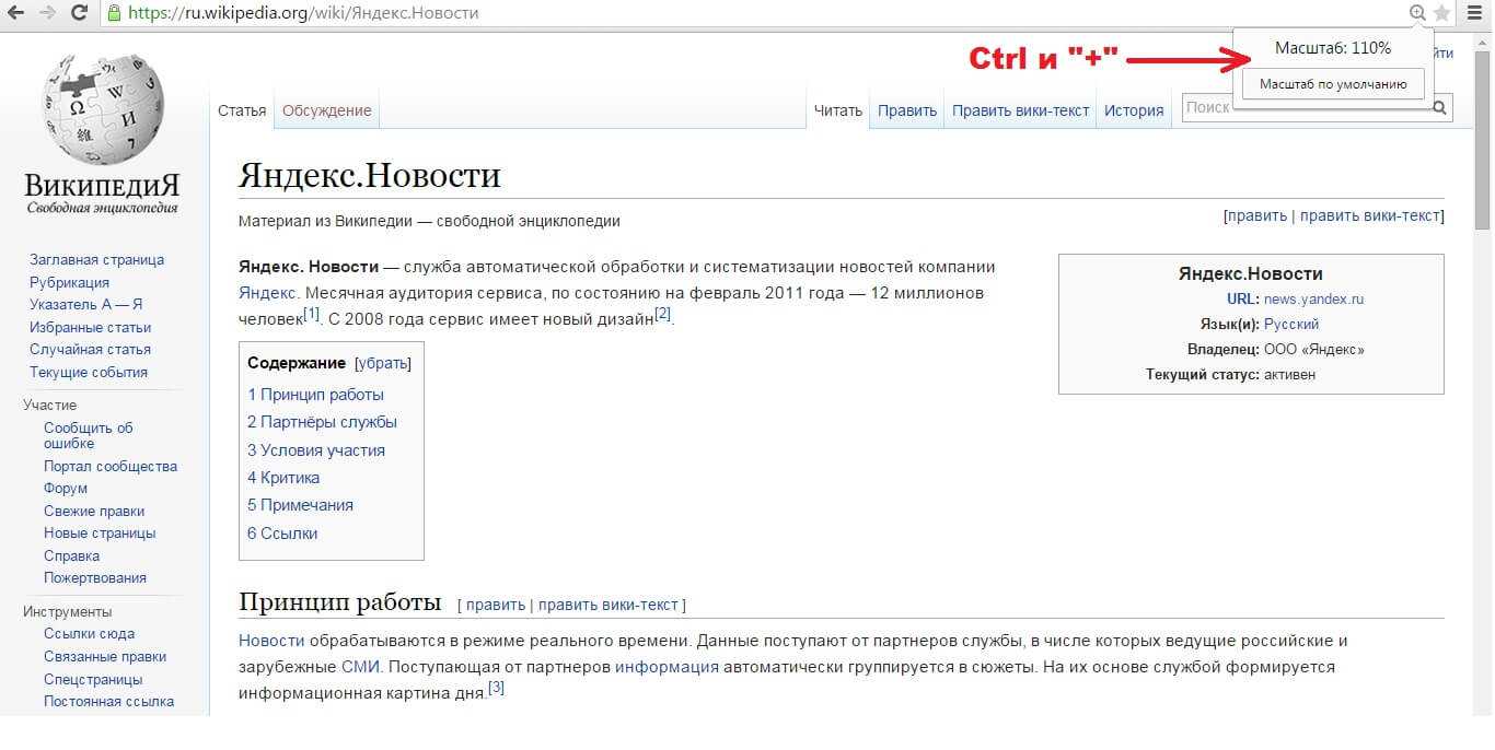 Уменьшить или, наоборот, увеличить шрифт статьи, выложенной на интернет-страничке можно разными способами. Проще всего, конечно же, воспользоваться одновременным нажатием на клавиатуре Ctrl и кнопки «+» (для увеличения масштаба) или «-» (для уменьшения размера):