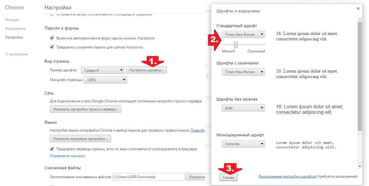 Соответственно, дабы изменить тип шрифта для веб-страниц, достаточно вместо стандартного Times New Roman выбрать любой другой подходящий вариант и нажать кнопку «Готово». В то же время в этом окошке можно одновременно задать и размер текста по умолчанию, просто перетянув рычажок под вкладкой: