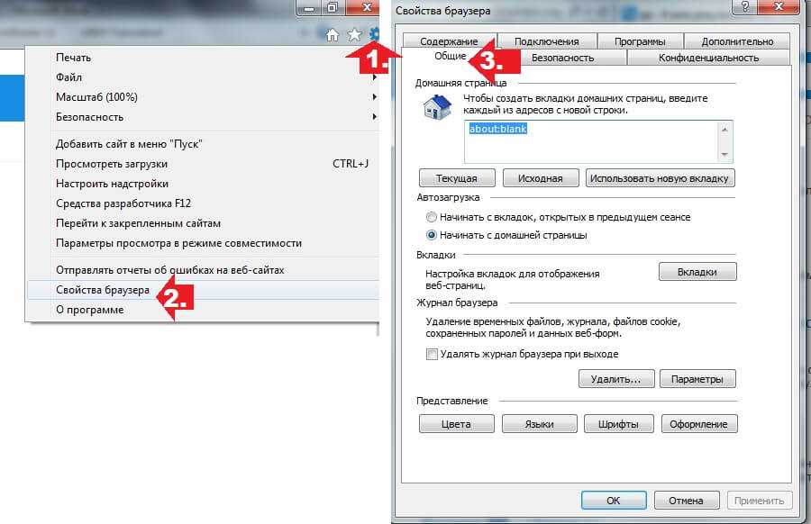 Свои особенности есть и в настройке шрифтовых параметров при работе с Internet Explorer. В этом случае дабы изменить тип шрифта, нам понадобится вначале открыть меню браузера, выбрать в нем пункт «Свойства браузера», а затем в появившемся окошке перейти в раздел «Общие»:
