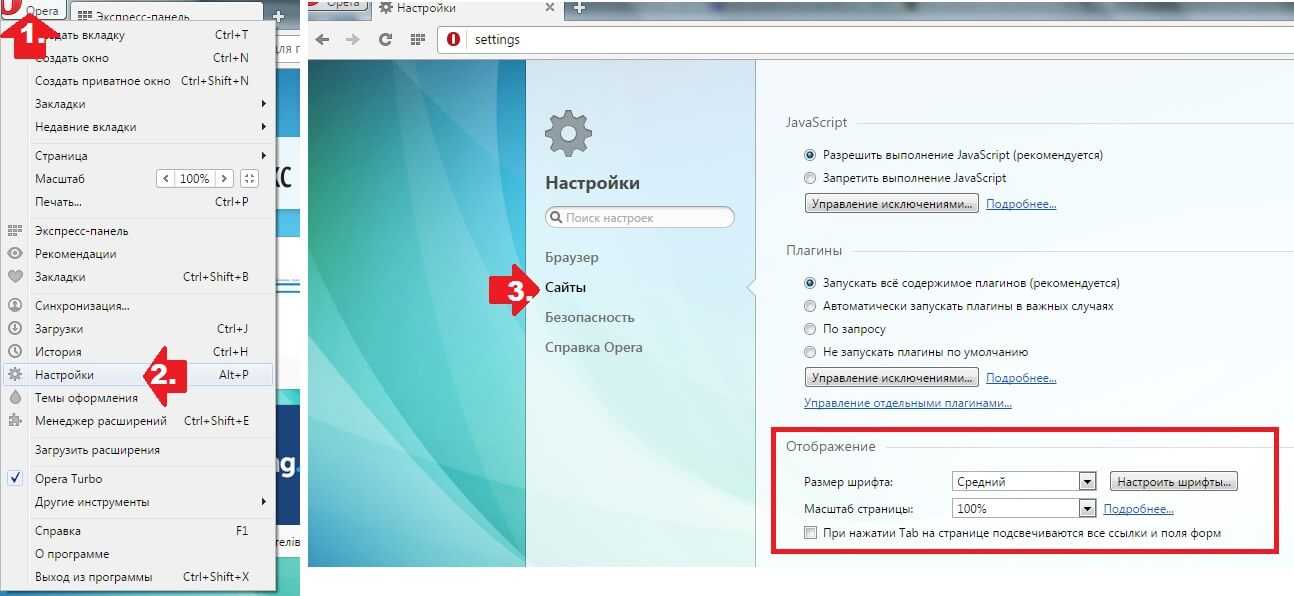Выставить размер шрифта для Opera легче и не придумаешь. В этом случае от нас требуется лишь поочередно выполнить 4 простые действия: