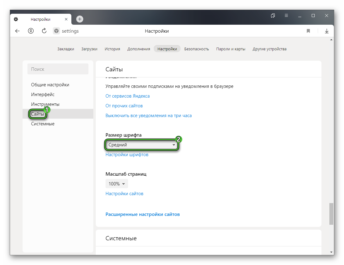 Теперь посетите вкладку «Сайты», расположенную в левом меню. На открывшейся странице нам интересен параметр «Размер шрифта».