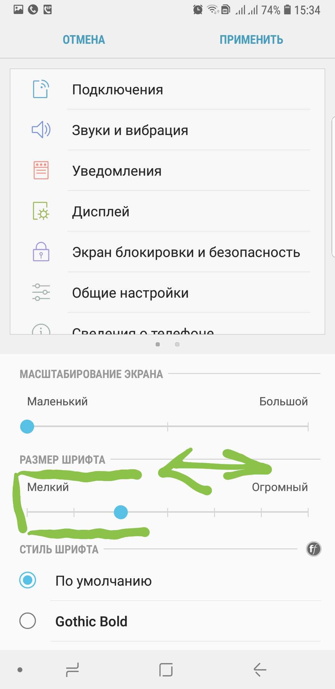 Совет. Когда вы будете двигать ползунок, то увидите, как выбранный шрифт или масштаб будет выглядеть на экране. При необходимости можно отменить изменения, нажав Сбросить настройки. В этом случае будут восстановлены исходные параметры телефона.