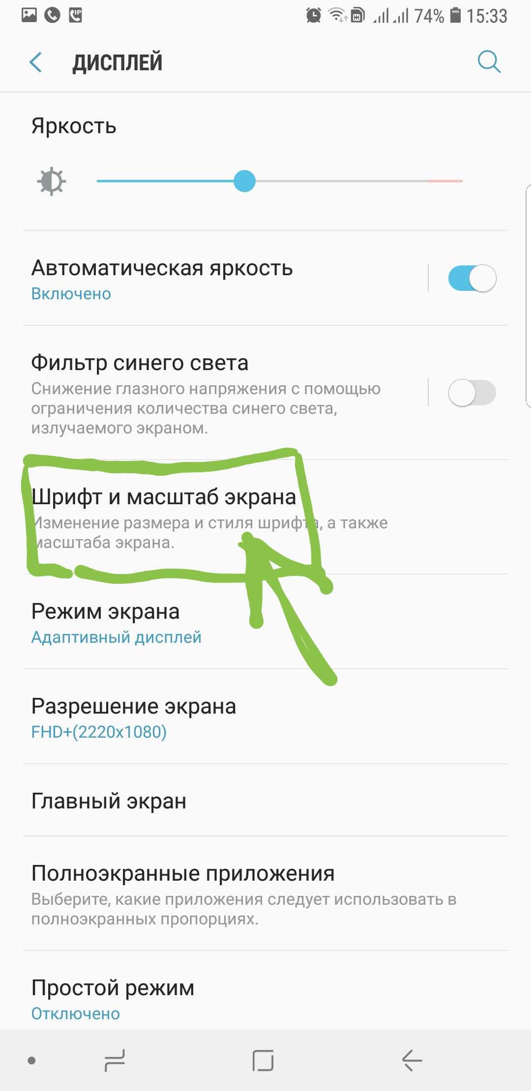 Откройте пункт меню «Шрифт и масштаб экрана»;