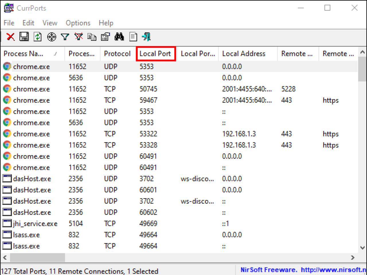 1. Будет показан список процессов на ПК. Отсортируйте их по «Локальному порту» для облегчения поиска.