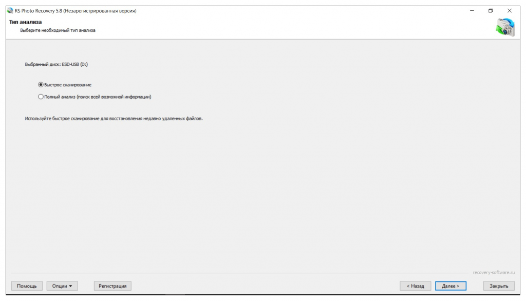 - Выберите вариант сканирование – быстрое или полный анализ. Лучше начать с экспресс-проверки. Если в результате нужные файлы не будут найдены, запустите повторно полный анализ.
