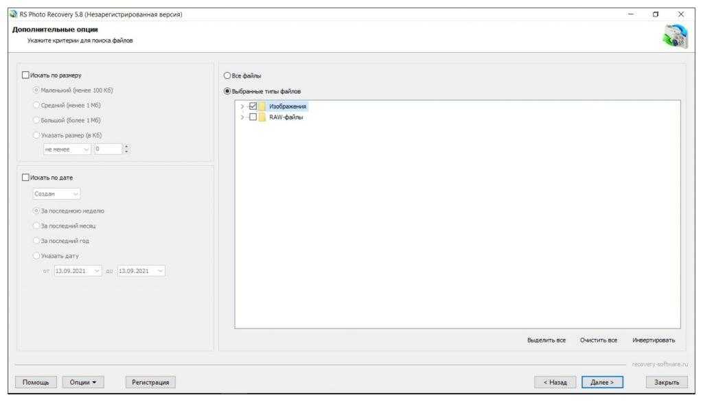 - Настройте опции поиска. Если точно знаете, когда были потеряны фотографии, сокращение периода ускорит время проверки.