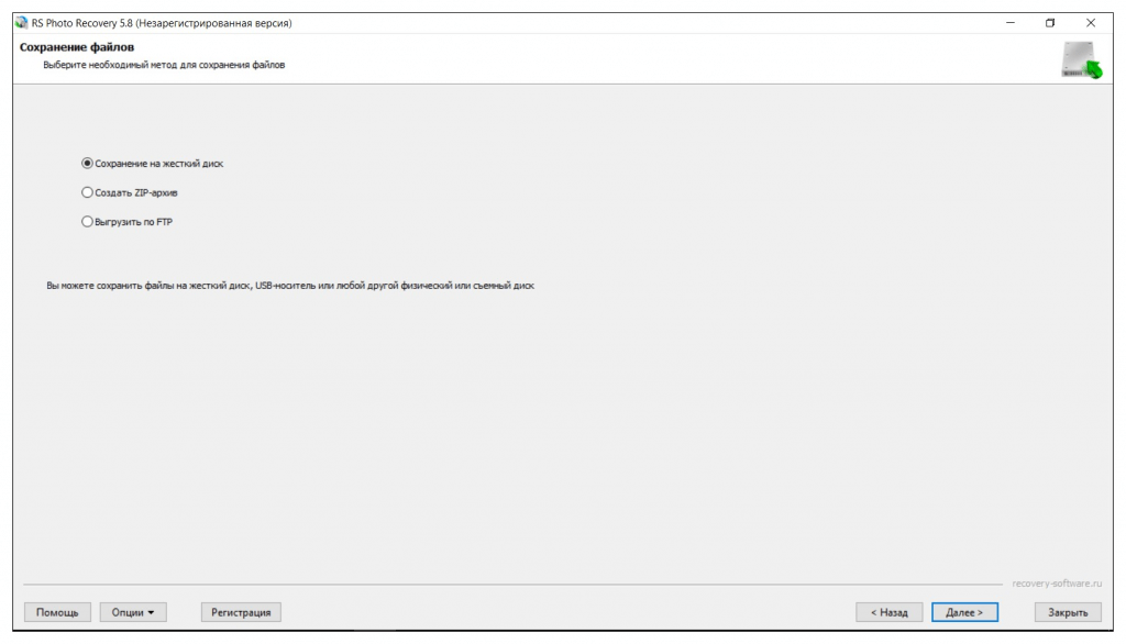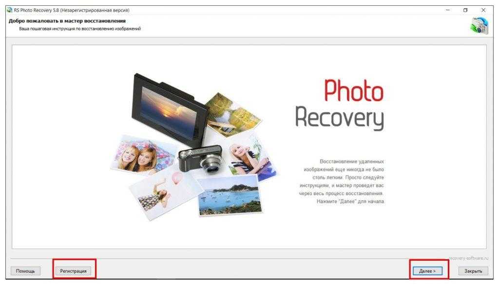 - Запустите RS Photo Recovery, нажмите «Далее», чтобы перейти к настройкам. Для демонстрации я использую бесплатную демоверсию программы. Вы можете сразу пройти регистрацию и приобрести платный вариант приложения с полным функционалом.