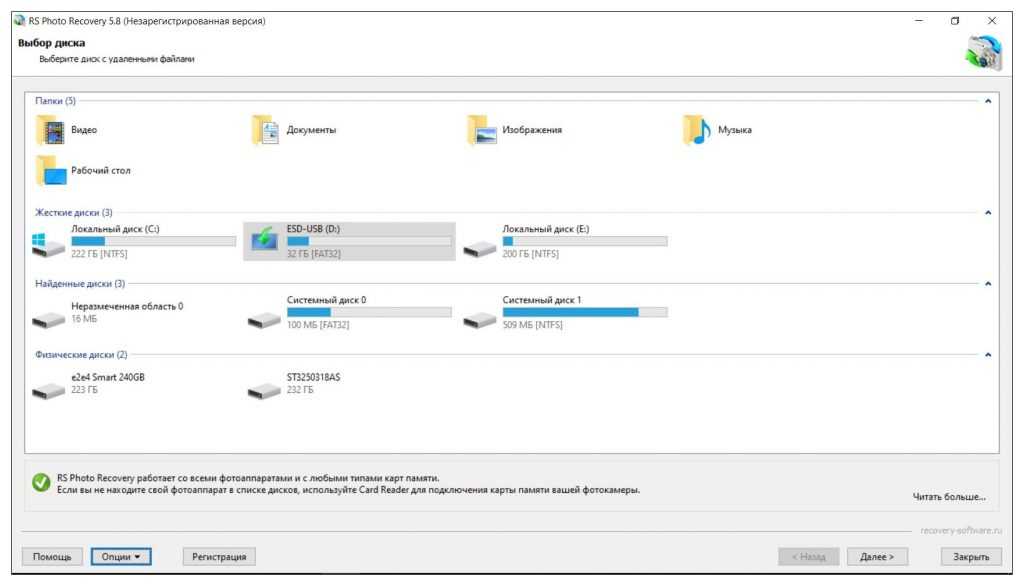 - Выберите носитель, на котором хотите запустить процедуру восстановления фотографий. Это может быть внутренняя память смартфона или SD-карта. Если карта памяти не отображается, ее необходимо вынуть из смартфона и подключить к компьютеру через картридер.