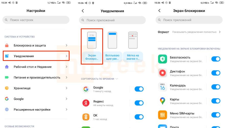 Все действия происходят в разделе настроек «Уведомления». После перехода в этот пункт меню выбираем «Уведомления приложений» и «Экран блокировки» для настроек уведомлений на нем. Также можно настроить общий показ от определенных приложений, которые установлены на смартфоне Xiaomi.