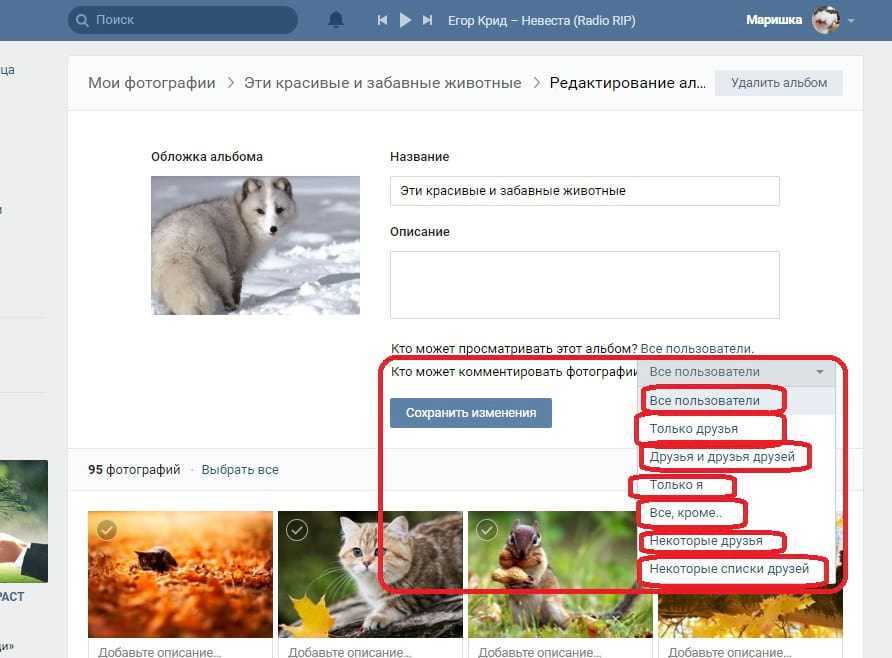 Отдельная тема для разговора — комментарии под фотографиями. Социальная сеть позволяет гибко регулировать возможности для обсуждений загруженных изображений при группировке их по альбомам — настройки устанавливаются для конкретного альбома.