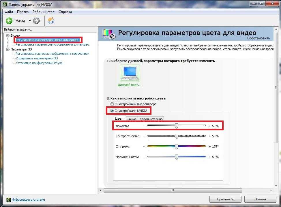 В меню регулировки цвета нужно перейти к графе «2. Как выполнить настройки цвета» и поставить переключатель «С настройками NVIDIA». Выбрав данные параметры, у вас появится возможность регулировки четырех свойств, среди которых яркость дисплея. Чтобы увеличить или уменьшить яркость дисплея, перетяните ползунок к плюсу или к минусу и вы увидите, как меняется подсветка экрана.