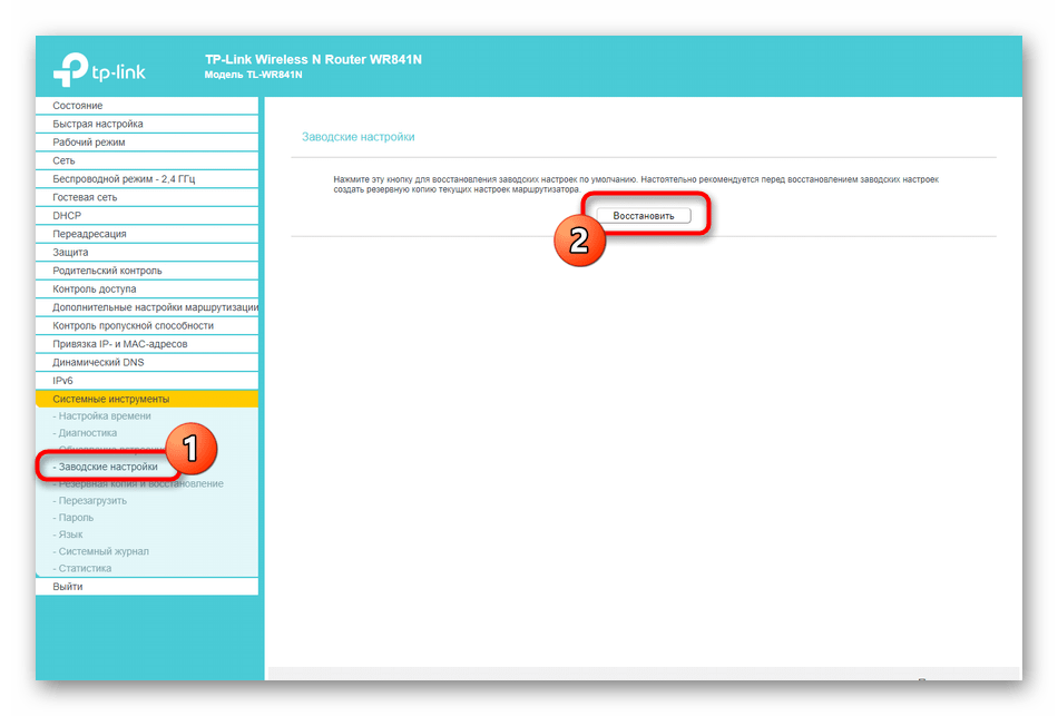 TP-Link — один из крупнейших в мире производителей роутеров, и на нашем сайте есть отдельная инструкция, полностью посвященная восстановлению заводской конфигурации этого оборудования. Если вы являетесь обладателем маршрутизаторов TP-Link, рекомендуем ознакомиться с ней, чтобы узнать, как именно осуществляется сброс через веб-интерфейс.