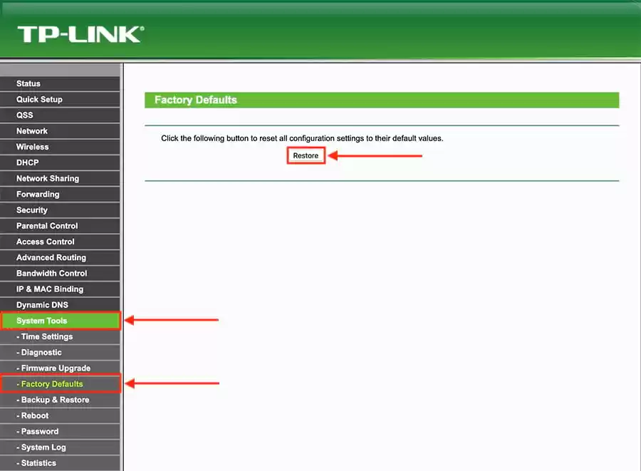 Предположим, что вы случайно изменили важнейшие параметры сети и не знаете, как именно вернуть настройки роутера в прежнее состояние — вместо того, чтобы подбирать нужные значения определённых пунктов меню, лучше выполнить полный сброс и начать всё «с нуля». Доступ к веб-клиенту у вас должен сохраниться — включайте его, используя стандартный адрес, имя и пароль. Вас будет интересовать меню важнейших настроек роутера — в зависимости от конкретного производителя, оно может называться System Tools, Maintenance, «Параметры», «Системные настройки» и т. д.