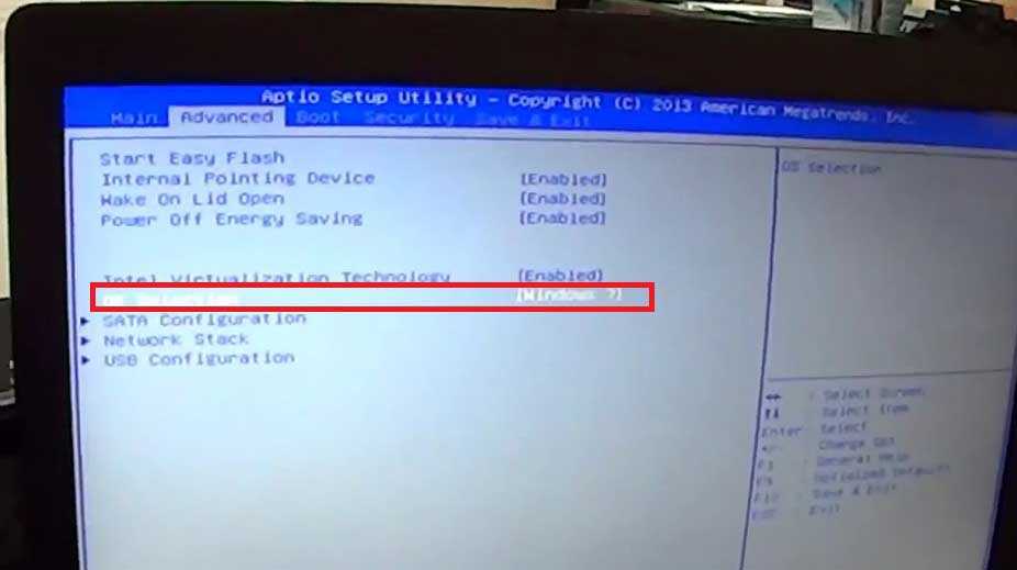 После этого на экране появится шкала загрузки, вам осталось дождаться завершения процесса. Не выключайте ноутбук во время обновления прошивки, рекомендуется, чтобы он был подключен к сети. После завершения процесс ноутбук перезагрузится. Снова заходим в BIOS и переходим во вкладку «Advanced». Теперь здесь есть опция «OS Selection». Нажмите на нее, чтобы выставить режим установки «Windows 7».