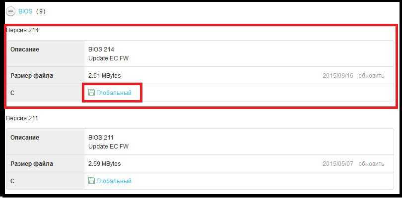Для начала выбираем тип операционной системы, здесь стоит поставить ваш вариант. После этого появится список категорий с драйверами. Здесь все просто – нажимаем на категорию BIOS, после чего открывается вкладка с последними обновлениями. Выбираем самые последние, в моем случае это версия 214. Если вы будете читать статью позже, у вас будут более свежие драйвера. В общем, нужно выбрать самую верхнюю версию.
