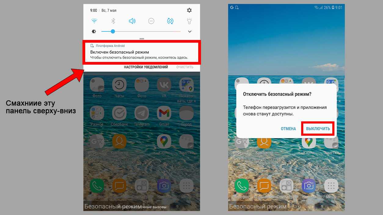 Смахните верхнюю «шторку» сверху вниз (т.е. верхнюю панель уведомлений, где отображается время, сети и т.д.). Нажмите на надпись «Включен безопасный режим» и выключите его, подтвердив во всплывающем окне соответствующей кнопкой.