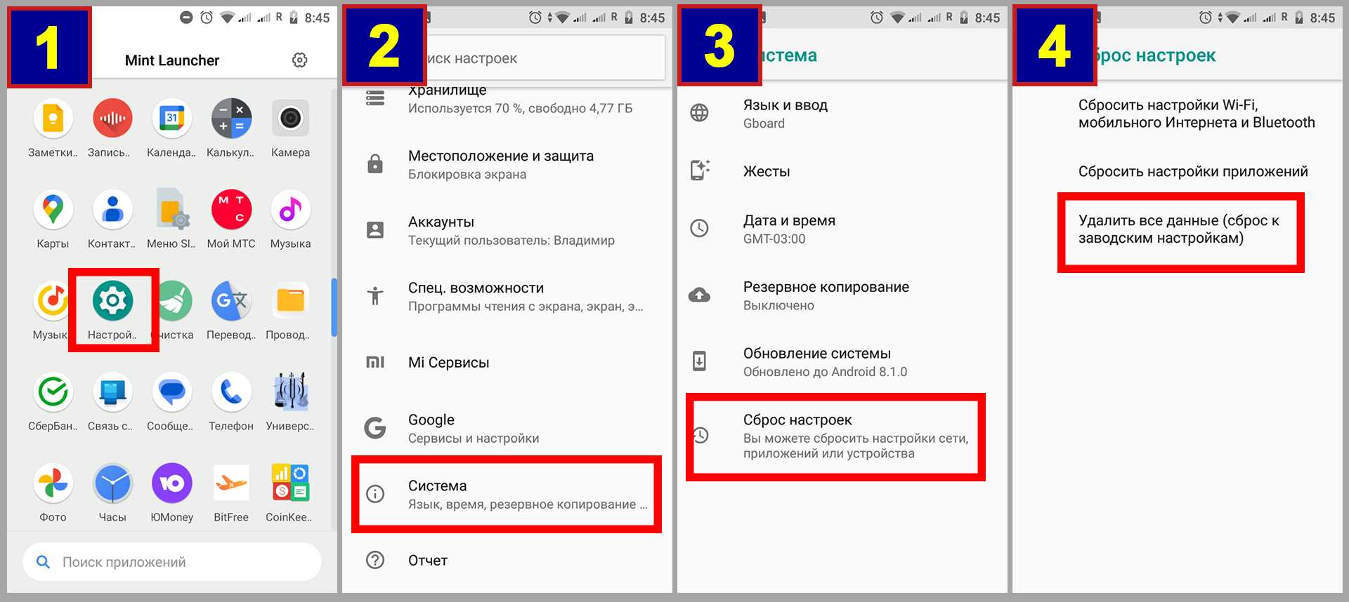 Сделать сброс можно так (порядок и названия пунктов могут отличаться в зависимости от версии Андройд):